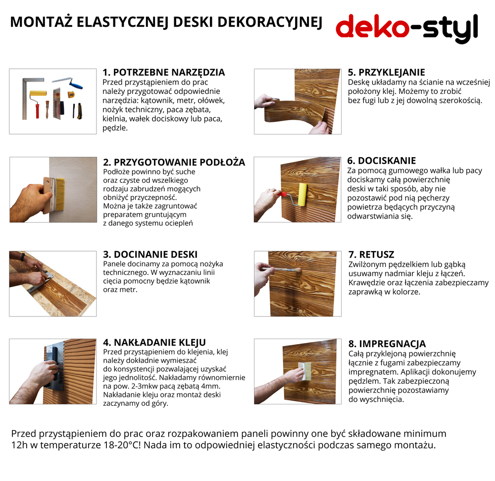 Uwaga – aklimatyzacja produktu: przed montażem lamele należy składować minimum 12 godzin w temperaturze 18–20°C, aby uzyskać odpowiednią elastyczność.